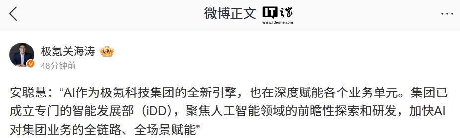 极氪智能科技 CMO 关海涛今日分享了吉利控股集团总裁、极氪智能科技 CEO 安聪慧的发言:“AI 作为极氪科技集团的全新引擎,也在深度赋能各个业务单元。集团已成立专门的智能发展部(iDD),聚焦人工智能领域的前瞻性探索和研发,加快 AI 对集团业务的全链路、全场景赋能。”